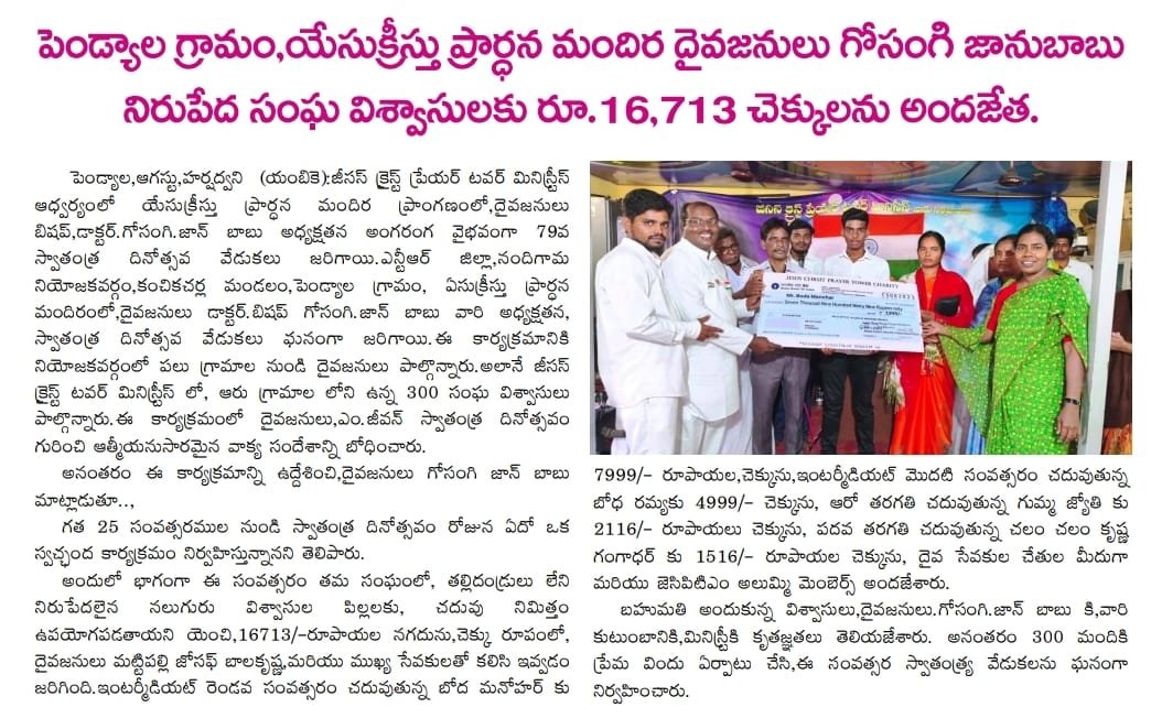 Our organization is led by a visionary leader, Sri. GOSANGI JOHNBABU, whose unwavering commitment to our cause has been the driving force behind our success. Established in 2008, since then the organization has been expanding continuously in terms of social and Educational Development and Medical services, Food, and Sheltering for Orphans. It has worked for the promotion of sustainable, equitable, and participatory development, social welfare, a...